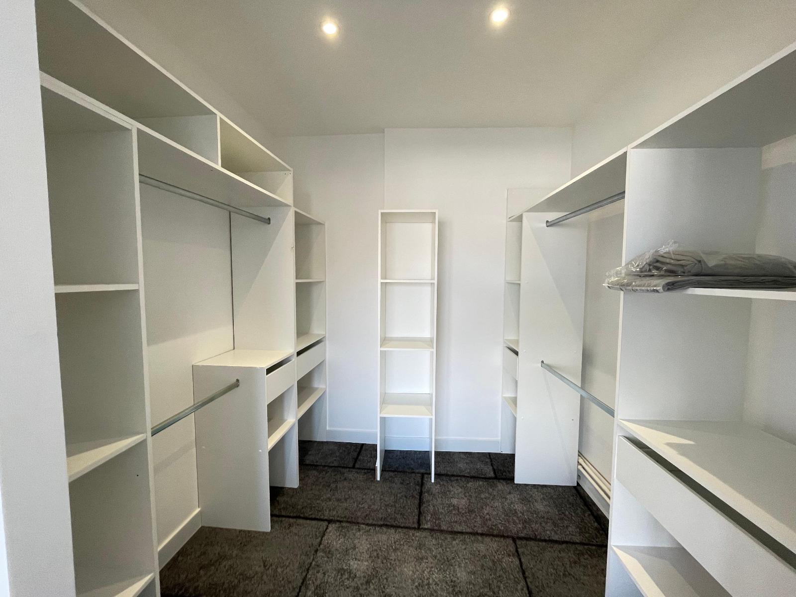 un placard aménagé en dressing, une salle d'eau avec douche et buanderie pour machine à laver.