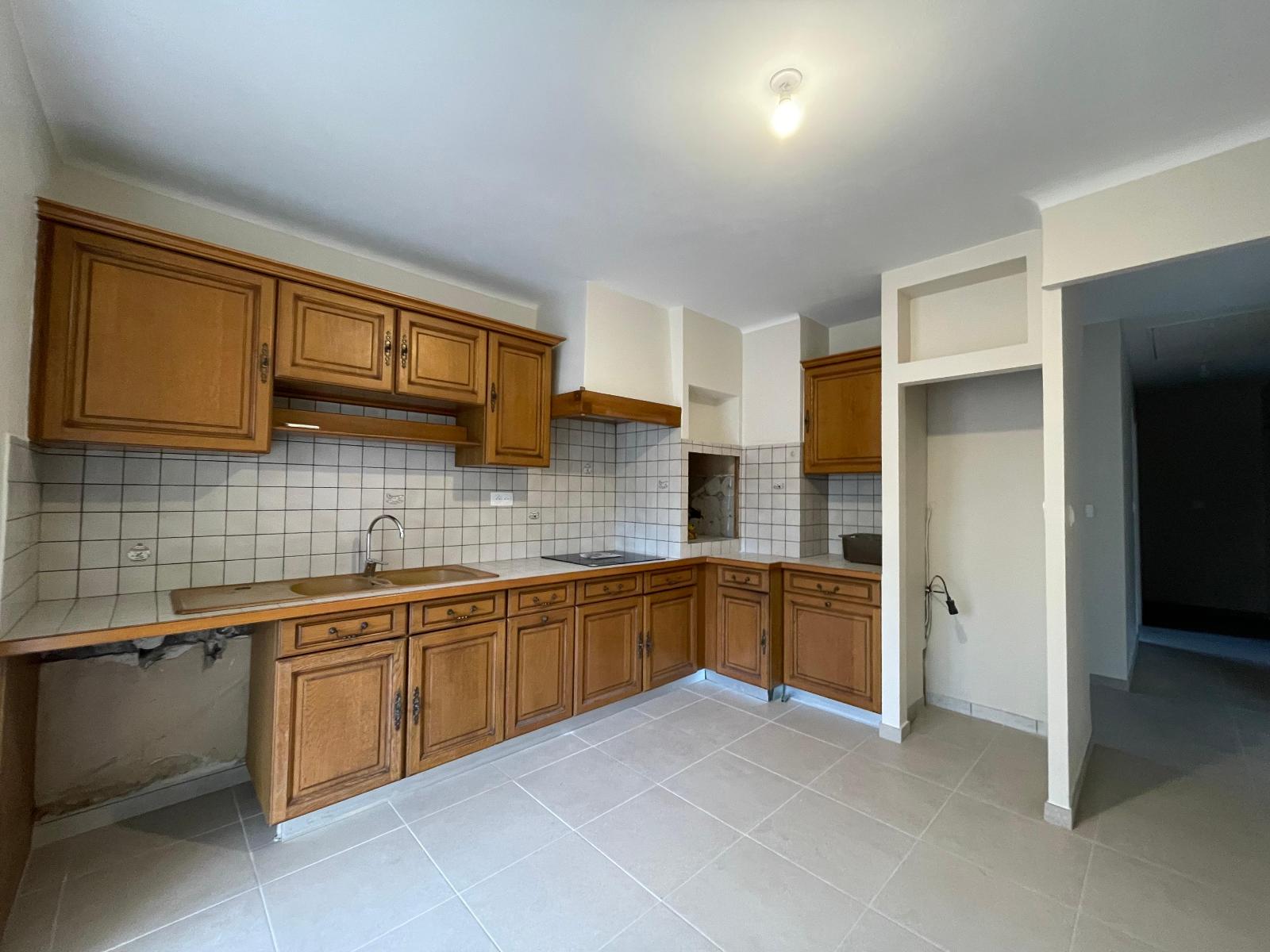 une cuisine aménagée et équipée d'une plaque et une hotte, 3 chambres (9 m² et 2 de 10 m²). Salle d'eau avec douche