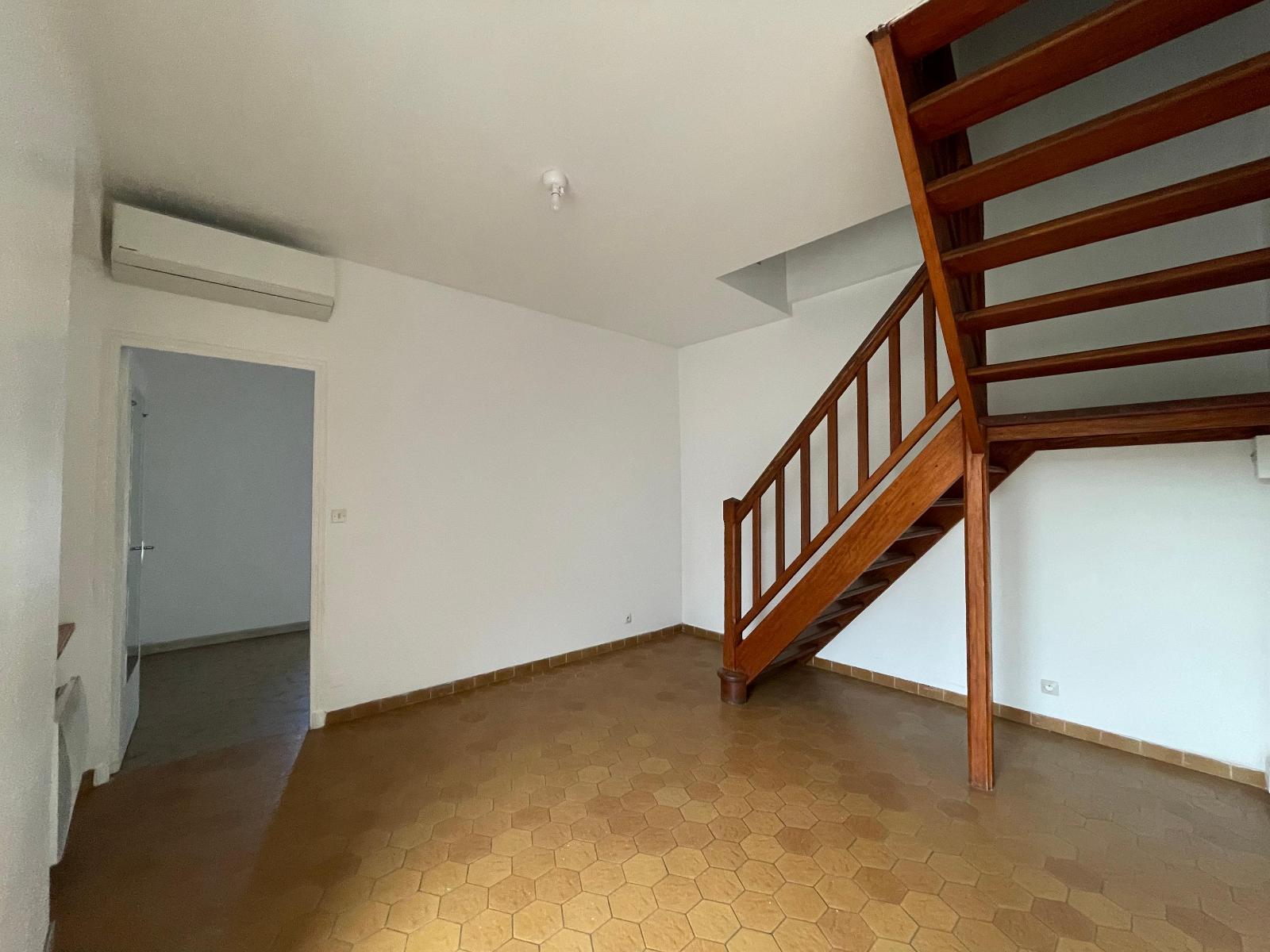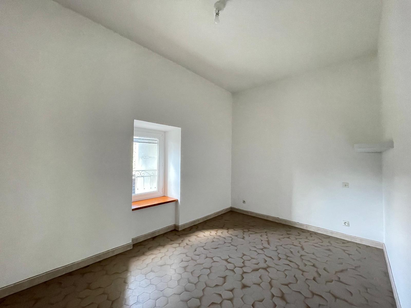 coin cuisine équipée d'une plaque et une hotte aspirante, un wc, un coin salon salle à manger/salon 14 m², une pièce en enfilade avec escalier de 11 m², une chambre de 9 m², au 2eme et dernier étage une 2nd chambre mansardée de 7 m² et une 3eme de 13 m², avec accès à la salle de bains et wc.