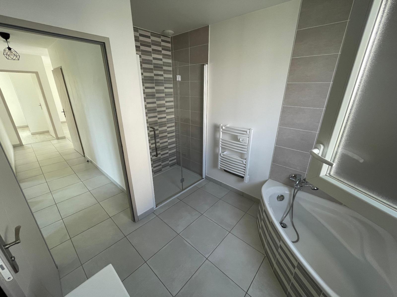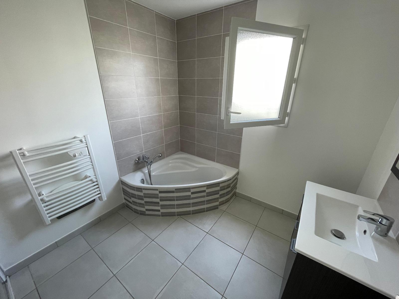 salle de bains avec baignoire et douche italienne. Jardin entièrement clôturé.